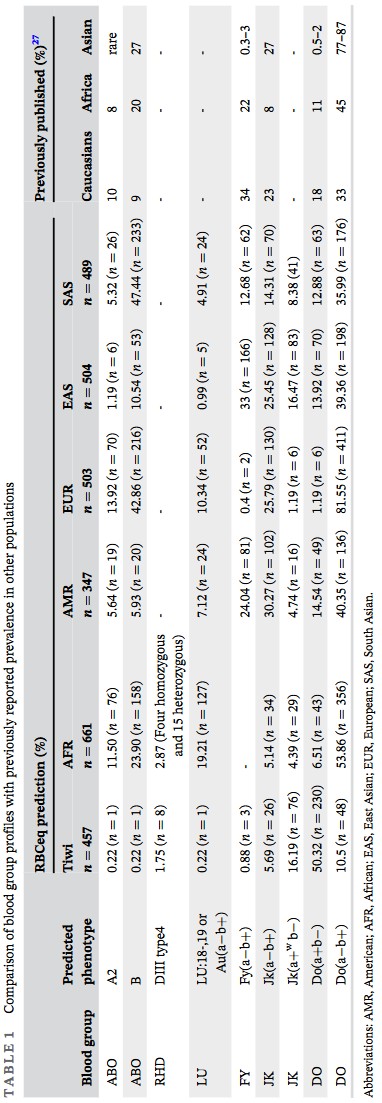 在ABO血型系统中,A2亚型主要存在于欧洲和非洲人群。Lutheran血型系统中的Au(ab+)表型在所有六个人群中都有发现,但频率各异。弱Jk(a+wb)表型在东亚和提维参与者中的流行率最高。