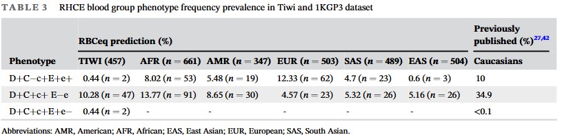 图7 提维人群和1KGP3数据集中RHCE血型表型频率分布