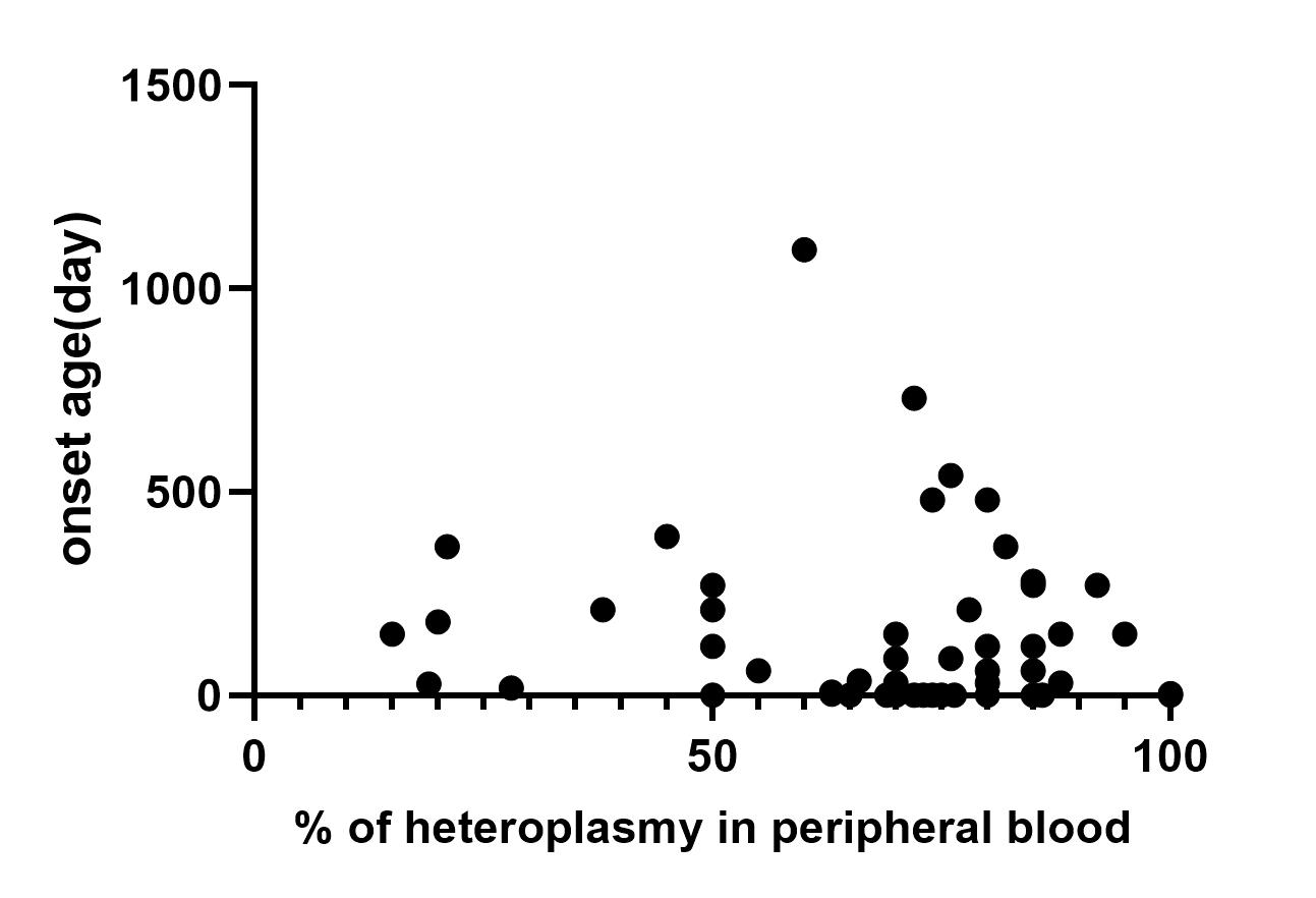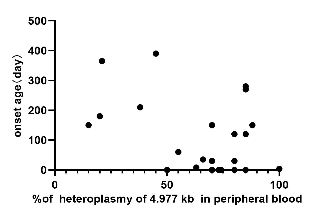 图7 外周血线粒体DNA缺失的异质性与发病年龄的相关性