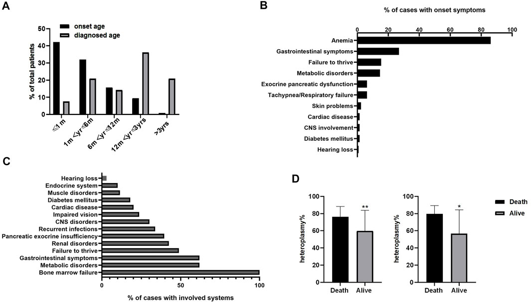 130例有明确的初始症状。最常见的症状为需要反复输血的难治性贫血,共112例,其中27例为合并中性粒细胞减少或血小板减少,58例以贫血为初始症状,35例有胃肠道症状(呕吐、腹泻和喂养困难),,20例生长发育迟缓,19例有代谢紊乱(代谢性酸中毒、高乳酸血症、低血糖和电解质紊乱),8例有胰腺外分泌功能不全。