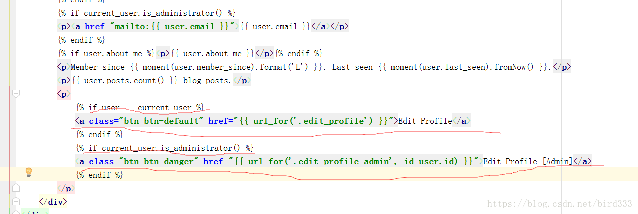 {% if current_user.is_administrator() %}如果用户是管理员,则再显示一个btn-danger,btn上显示"Edit Profile [Admin]",链接到.edit_profile_admin视图函数。