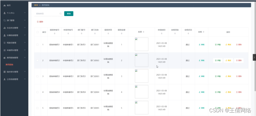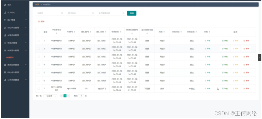 申请用车管理,在申请用车管理页面可以查看索引、申请单编号、车牌号、部门账号、部门名称、申请时间、预计归还时间、是否需要司机、用途、审核回复、审核状态、审核等信息,并可根据需要进行修改或删除等操作,如图5-7所示。