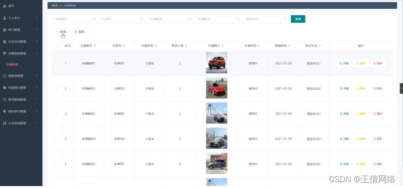车辆信息管理,在车辆信息管理页面可以查看索引、车辆编号、车牌号、车辆类型、限乘人数、车辆图片、车辆状态、购置时间、固定车位等信息,并可根据需要进行修改或删除等操作,如图5-5所示。