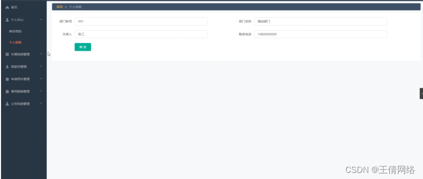 部门登录进入智能化车辆管理综合信息平台可以查看首页、个人中心、车辆信息管理、驾驶员管理、申请用车管理、费用报销管理、公告信息管理等内容,如图5-11所示。