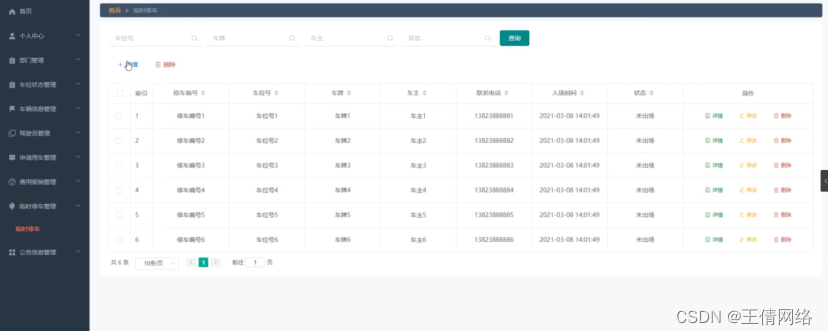 临时停车管理,在临时停车管理页面可以查看索引、停车编号、车位号、车牌、车主、联系电话、入场时间、状态等信息,并可根据需要进行修改或删除等操作,如图5-9所示。