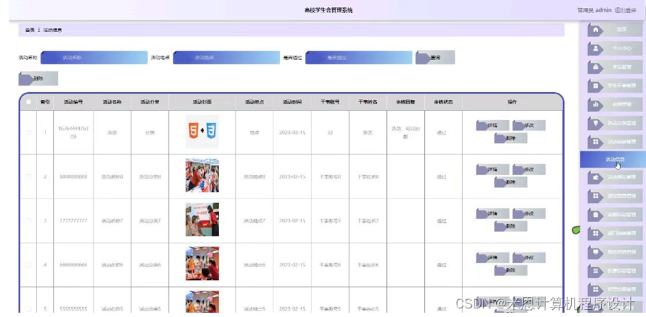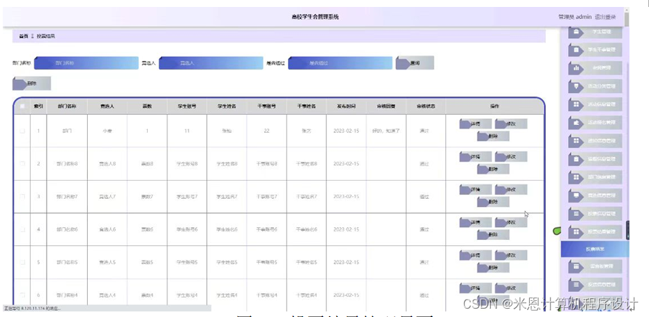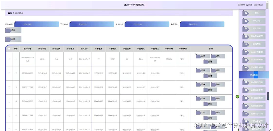 管理员点击活动报名管理。在活动报名页面输入活动名称,干事姓名,学生姓名和选择是否通过进行查询或删除活动报名列表;并根据需要对活动报名详细信息进行详情、修改或删除操作,如图5-3所示: