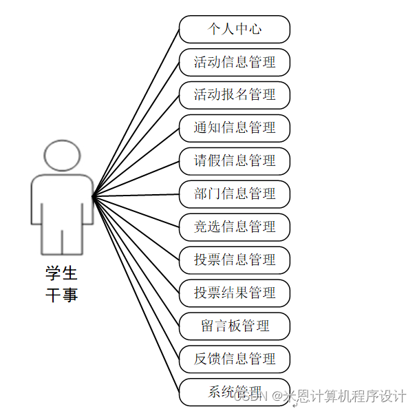 学生干事:学生干事登录进入系统可以实现对个人中心,活动信息管理,活动报名管理,通知信息管理,请假信息管理,部门信息管理,竞选信息管理,投票信息管理,投票结果管理,留言板管理,反馈信息管理,系统管理等进行操作。学生干事用例如图3-3所示。