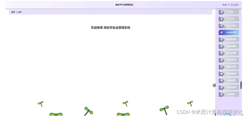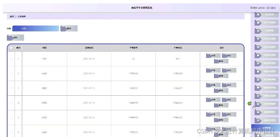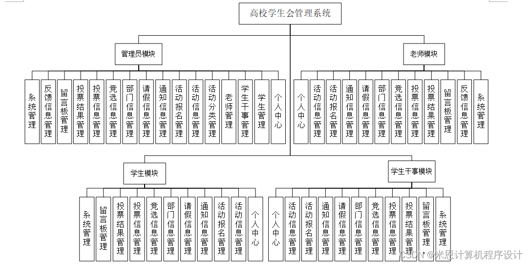 高校学生会管理系统主要有管理员,学生,学生干事和老师四个功能模块。以下将对这四个功能的作用进行详细的剖析。