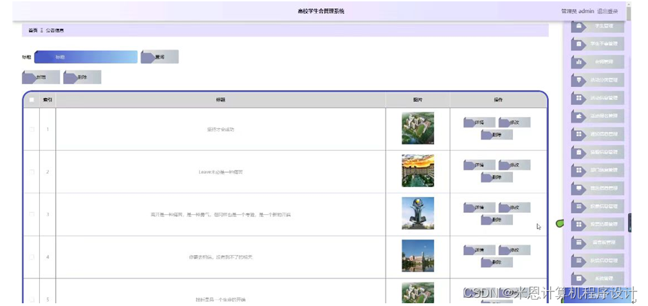 管理员点击系统管理。在公告信息页面输入标题进行查询,新增或删除公告信息列表;并根据需要对公告详细信息进行详情、修改或删除操作。如图5-10所示: