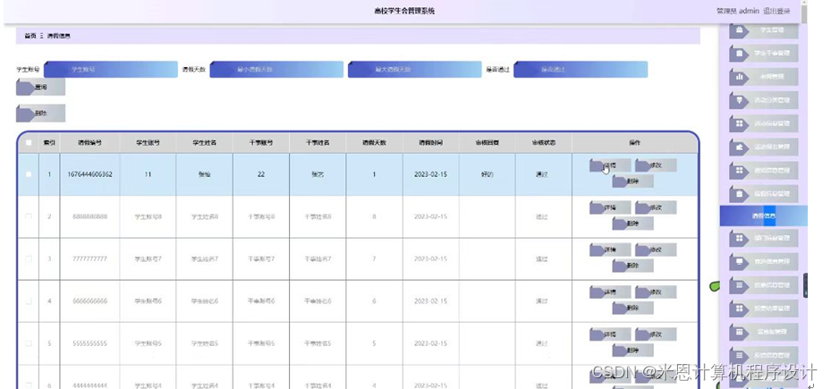 管理员点击请假信息管理。在请假信息页面输入学生账号,请假天数和选择是否通过进行查询或删除请假信息列表;并根据需要对请假详细信息进行详情、修改或删除操作。如图5-5所示: