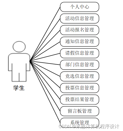 学生:学生登录进入系统可以实现对个人中心,活动信息管理,活动报名管理,通知信息管理,请假信息管理,部门信息管理,竞选信息管理,投票信息管理,投票结果管理,留言板管理,系统管理等进行操作。学生用例如图3-2所示。