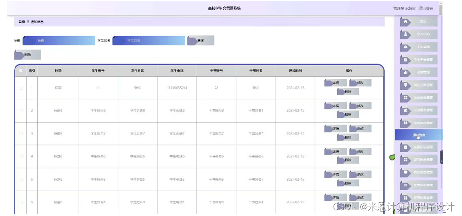 管理员点击通知信息管理。在通知信息页面输入标题和学生姓名进行查询或删除通知信息列表;并根据需要对通知详细信息进行详情、修改或删除操作。如图5-4所示: