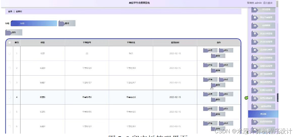 管理员点击留言板管理。在留言板页面输入标题进行查询或删除留言板列表;并根据需要对留言板详细信息进行详情、修改或删除操作。如图5-8所示: