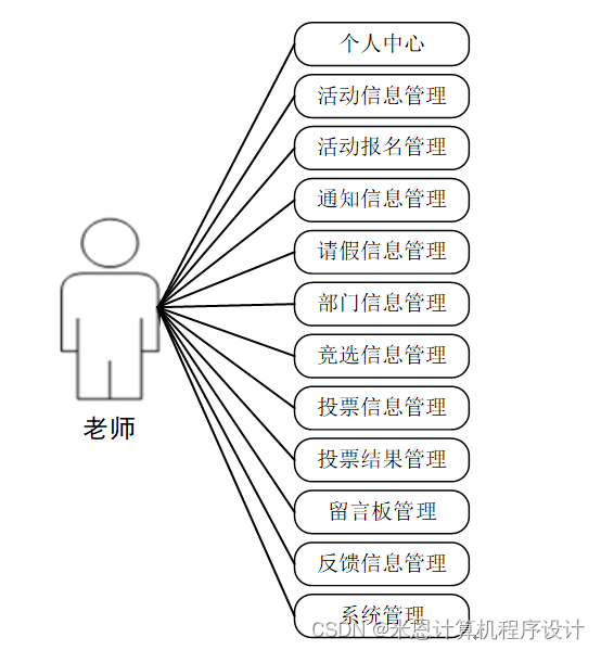 老师:老师登录进入系统可以实现对个人中心,活动信息管理,活动报名管理,通知信息管理,请假信息管理,部门信息管理,竞选信息管理,投票信息管理,投票结果管理,留言板管理,反馈信息管理,系统管理等进行操作。老师用例如图3-4所示。