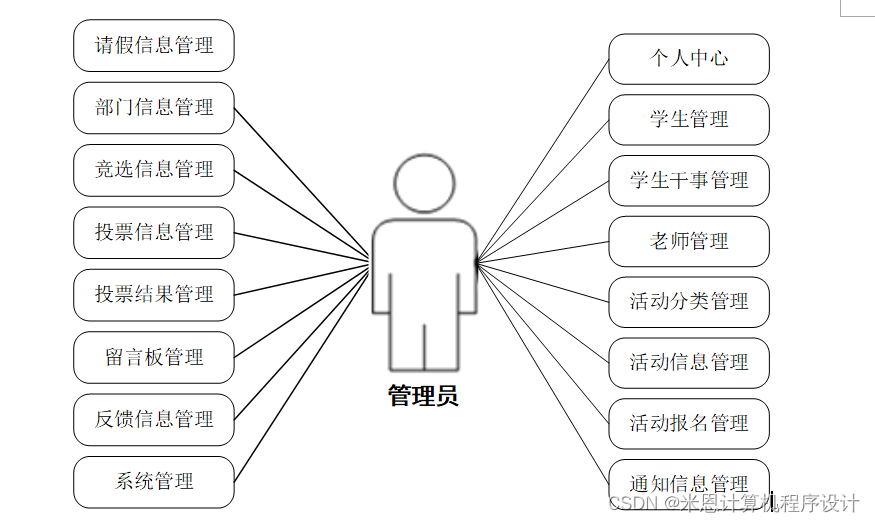 管理员模块:管理员是系统中的核心用户,管理员登录后,可以对后台系统进行管理。主要功能有个人中心,学生管理,学生干事管理,老师管理,活动分类管理,活动信息管理,活动报名管理,通知信息管理,请假信息管理,部门信息管理,竞选信息管理,投票信息管理,投票结果管理,留言板管理,反馈信息管理,系统管理等功能。管理员用例如图3-1所示。