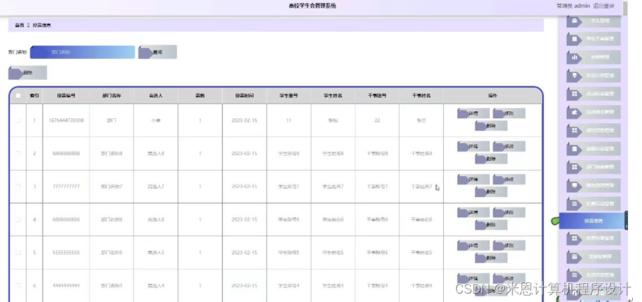 管理员点击投票信息管理。在投票信息页面输入部门名称进行查询或删除投票信息列表;并根据需要对投票详细信息进行详情、修改或删除操作。如图5-6所示: