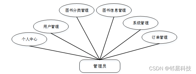 管理员登陆后,主要模块包括个人中心,用户管理,图书分类管理,图书信息管理,系统管理,订单管理等功能。管理员用例图如图3-1所示。