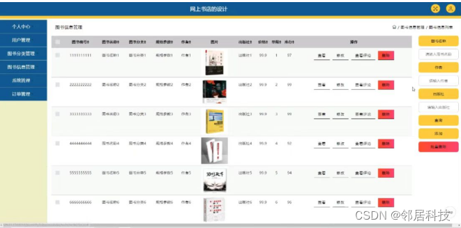 图书信息管理,在图书信息管理页面可以对图书编号,图书名称,图书分类,规格参数,作者,出版社,价格,单限,库存等内容进行查看,查看评论,修改和删除等操作;如图5-9所示。