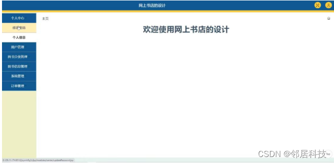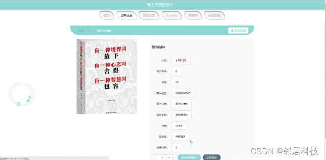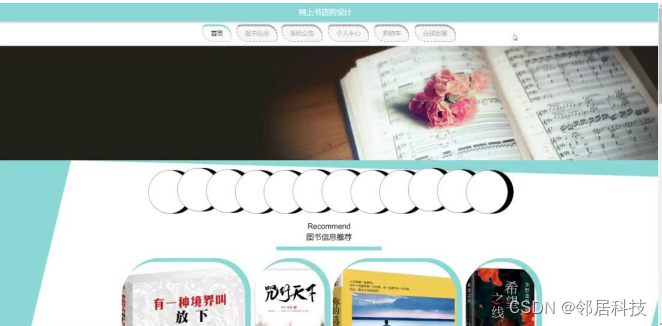 网上书店的设计,在系统首页可以查看首页,图书信息,系统公告,个人中心,购物车,在线客服等内容,并进行详细操作;如图5-1所示。