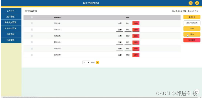 图书分类管理,在图书分类管理页面可以对图书分类进行查看,修改和删除操作,如图5-8所示。