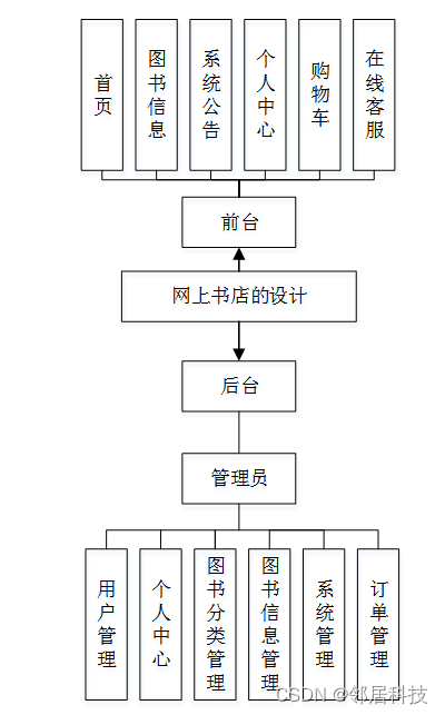 系统设计是把本系统的各项功能需求进行细化,而转换为软件系统表示的一个设计过程,在对目标系统的研究分析之后,做出整个系统平台的总体规划,进而对用例中各个对象进一步地合理精细设计。为降低整个系统的复杂度,而使其更加便于修改,提高代码的可读性,我们会将系统模块化,模块间保持相对独立,且每个模块只完成一个子功能,并且与其他模块通过简单的接口链接,即高内聚低耦合原则,而使整个系统能够拥有一个高性能的结构,这边是系统概要设计最重要的目的。在之前的需求分析的基础上,本网上书店的设计结构,如下图4-1所示。