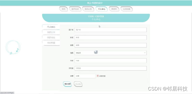 个人中心,在个人中心页面通过填写用户名,姓名,密码,性别,年龄,手机号,余额等内容进行更新信息,还可以根据需要对我的订单,我的地址,我的收藏进行相对应操作,如图5-4所示。