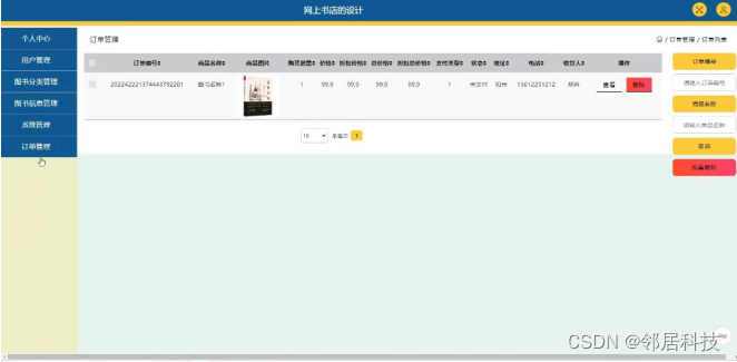 订单管理,在订单管理页面可以对订单编号,商品名称,商品图片,购买数量,价格,折扣价格,总价格,折扣总价格,支付类型,状态,地址,电话,收货人等内容进行详细操作;如图5-11所示。