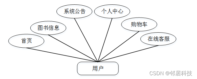 用户登陆后,主要模块包括首页,图书信息,系统公告,个人中心,购物车,在线客服等功能。用户用例图如图3-2所示。