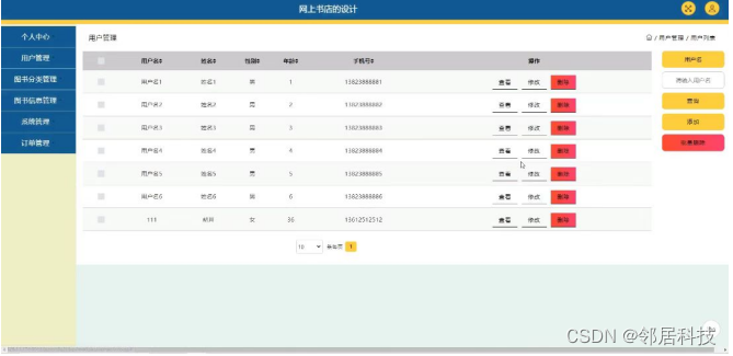 用户管理,在用户管理页面可以对用户名,姓名,性别,年龄,手机号等内容进行查看,修改和删除操作,如图5-7所示。