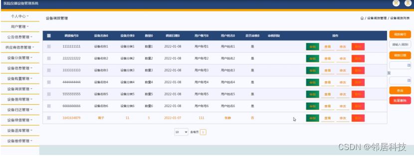 设备调拨管理,在设备调拨管理页面可以对调拨编号,设备名称,设备分类,数量,调拨日期,用户账号,用户姓名,是否审核,审核回复等内容进行审核,查看,修改和删除等操作,如图5-8所示。
