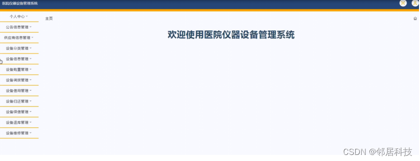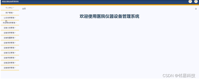 用户登录进入医院仪器设备管理系统可以对个人中心,公告信息管理,供应商信息管理,设备分类管理,设备信息管理,设备购置管理,设备调拨管理,设备借用管理,设备归还管理,设备续借管理,设备退库管理,设备维修管理等进行相应操作,如图5-11所示。