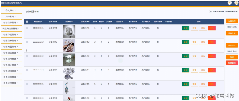 设备购置管理,在设备购置管理页面可以对购置编号,购置名称,购置图片,设备分类,进价,数量,总价格,注意事项,用户账号,用户姓名,是否审核,审核回复等内容进行审核,查看,修改和删除等操作,如图5-7所示。