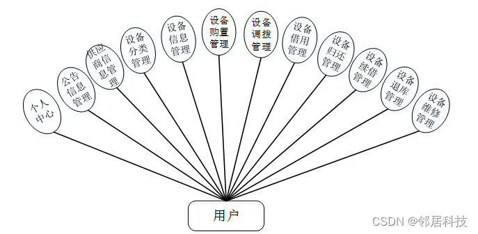 用户进入系统后能对个人中心,公告信息管理,供应商信息管理,设备分类管理,设备信息管理,设备购置管理,设备调拨管理,设备借用管理,设备归还管理,设备续借管理,设备退库管理,设备维修管理等功能进行用户范围内操作。用户用例图如图3-2所示。