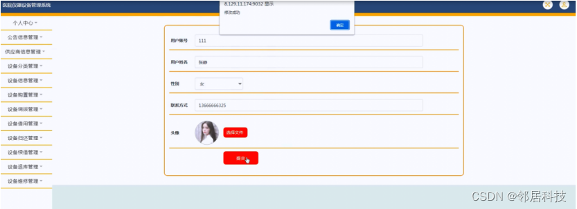 个人中心,在个人信息页面可以对用户账号,用户姓名,性别,联系方式,头像等内容进行提交操作,如图5-12所示。