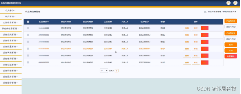 供应商信息管理,在供应商信息管理页面可以对供应商编号,供应商名称,供应商类型,主供设备,负责人,联系电话,地址等内容进行查看,修改和删除等操作,如图5-5所示。