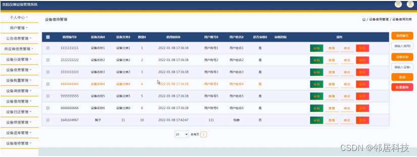 设备借用管理,在设备借用管理页面可以对借用编号,设备名称,设备分类,数量,借用时间,用户账号,用户姓名,是否审核,审核回复等内容进行审核,查看,修改和删除等操作,如图5-9所示。
