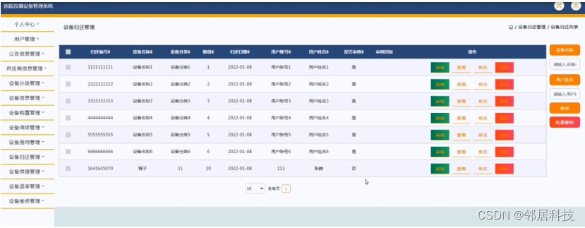 设备归还管理,在设备归还管理页面可以对归还编号,设备名称,设备分类,数量,归还日期,用户账号,用户姓名,是否审核,审核回复等内容进行审核,查看,修改和删除等操作,如图5-10所示。