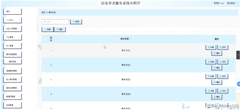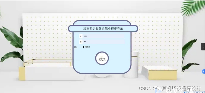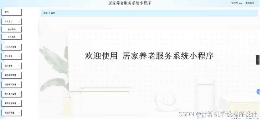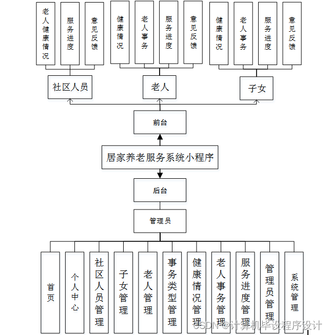 本课题要求实现一套居家养老服务系统小程序,系统主要包括前台模块(社区人员,子女,老人)和后台模块(管理员)等功能。