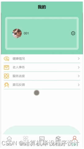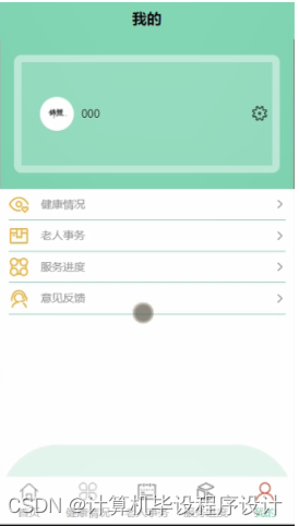 老人,在我的页面可以对健康情况,老人事务,服务进度,意见反馈等详细信息进行操作,如图5-4所示。