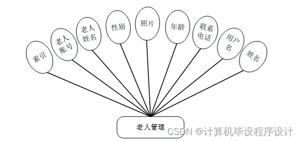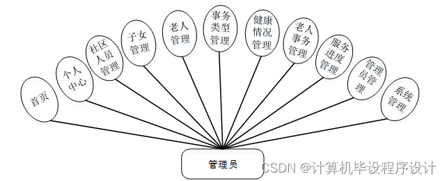 通过市场调研及咨询研究,了解了居家养老服务及管理者的使用需求,于是制定了管理员,社区人员,子女,老人等模块。功能结构图如下所示: