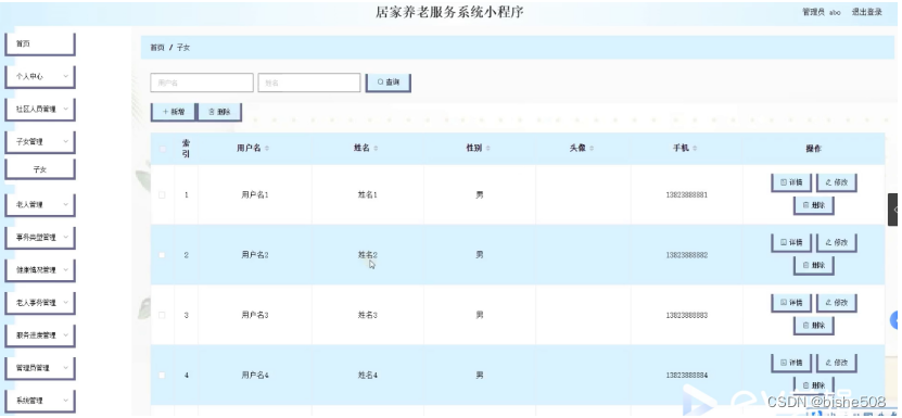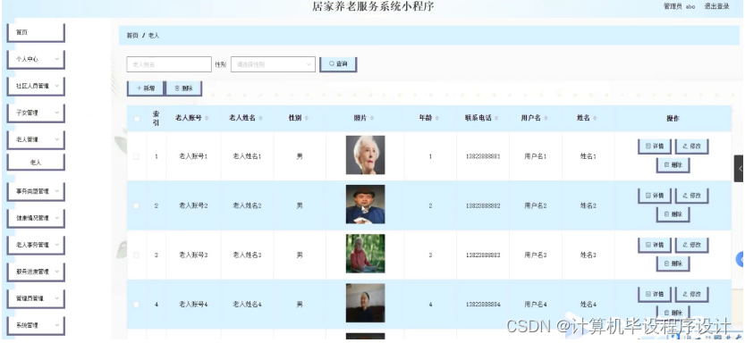 老人管理,在老人管理页面可以对索引,老人账号,老人姓名,性别,照片,年龄,联系电话,用户名,姓名等内容进行详情、修改或删除等操作,如图5-11所示。