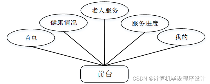(2)社区人员,子女和老人进入小程序首页可以实现首页,健康情况,老人事务,服务进度,我的等内容,前台用例图如下所示: