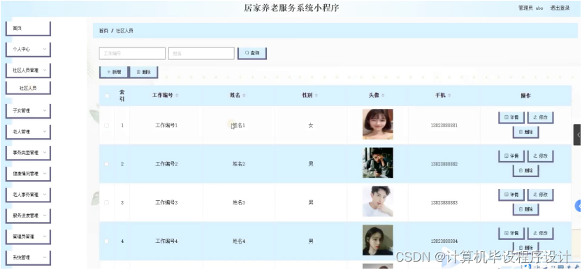 社区人员管理,在社区人员管理页面可以对索引,工作编号,姓名,性别,头像,手机等内容进行详情、修改或删除等操作,如图5-9所示。