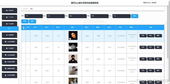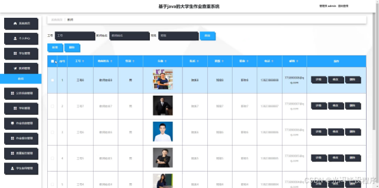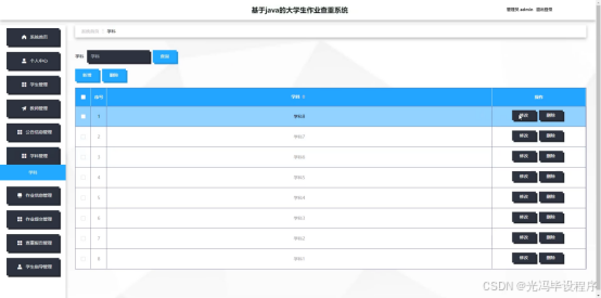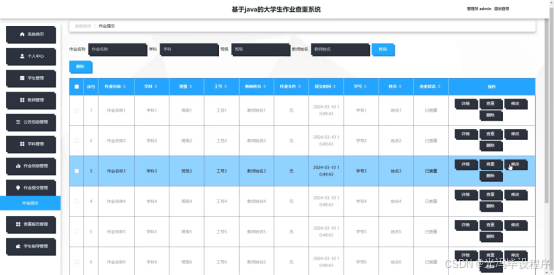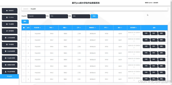 (3)管理员通过后台管理界面,实现对个人中心、学生管理、教师管理、公告信息管理、学科管理、作业信息管理、作业提交管理、查重报告管理、学生指导管理等功能的操作;