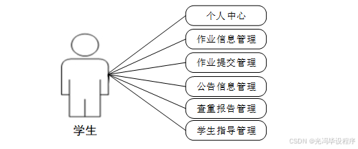 (3)学生关键功能包含个人中心、公告信息管理、作业信息管理、作业提交管理、查重报告管理、学生指导管理等进行管理。学生用例如下: