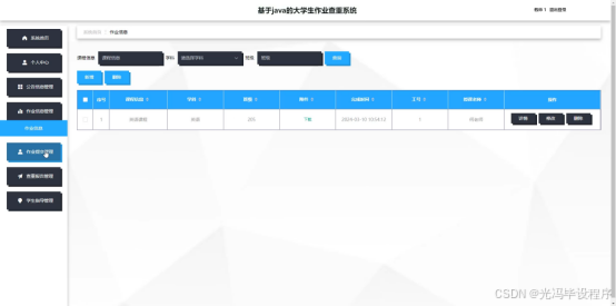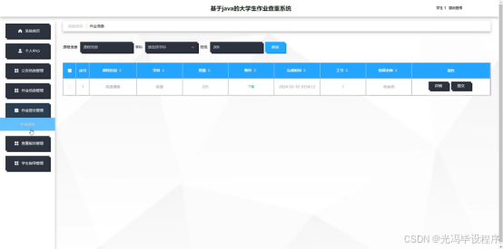 (1)学生登录系统可以对个人中心、公告信息管理、作业信息管理、作业提交管理、查重报告管理、学生指导管理等进行操作;