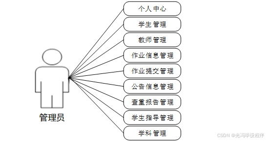 (1)管理员关键功能包含个人中心、学生管理、教师管理、公告信息管理、学科管理、作业信息管理、作业提交管理、查重报告管理、学生指导管理等进行管理。管理员用例如下: