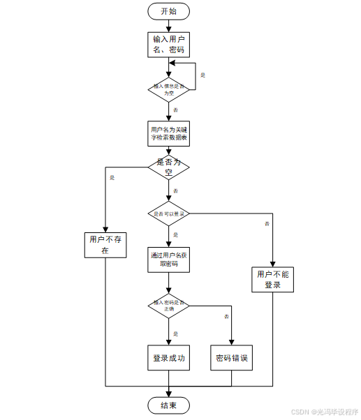 在登录流程中,用户首先在Vue前端界面输入用户名和密码。这些信息通过HTTP请求发送到Java后端。后端接收请求,通过与MySQL数据库交互验证用户凭证。如果认证成功,后端会返回给前端,允许用户访问系统。这个过程涵盖了从用户输入到系统验证和响应的全过程。如图5-1所示。