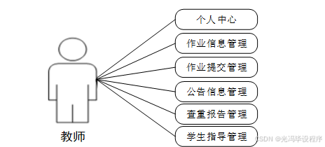 (2)教师关键功能包含个人中心、公告信息管理、作业信息管理、作业提交管理、查重报告管理、学生指导管理等进行管理。教师用例如下: