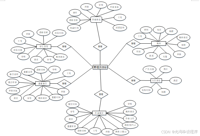 根据功能需求来对系统的e-r图来进行分解得到几种实体,在系统中将“学生指导、作业提交、教师、作业信息、查重报告、公告信息”等作为实体,它们的局部E-R如图4-2所示。
